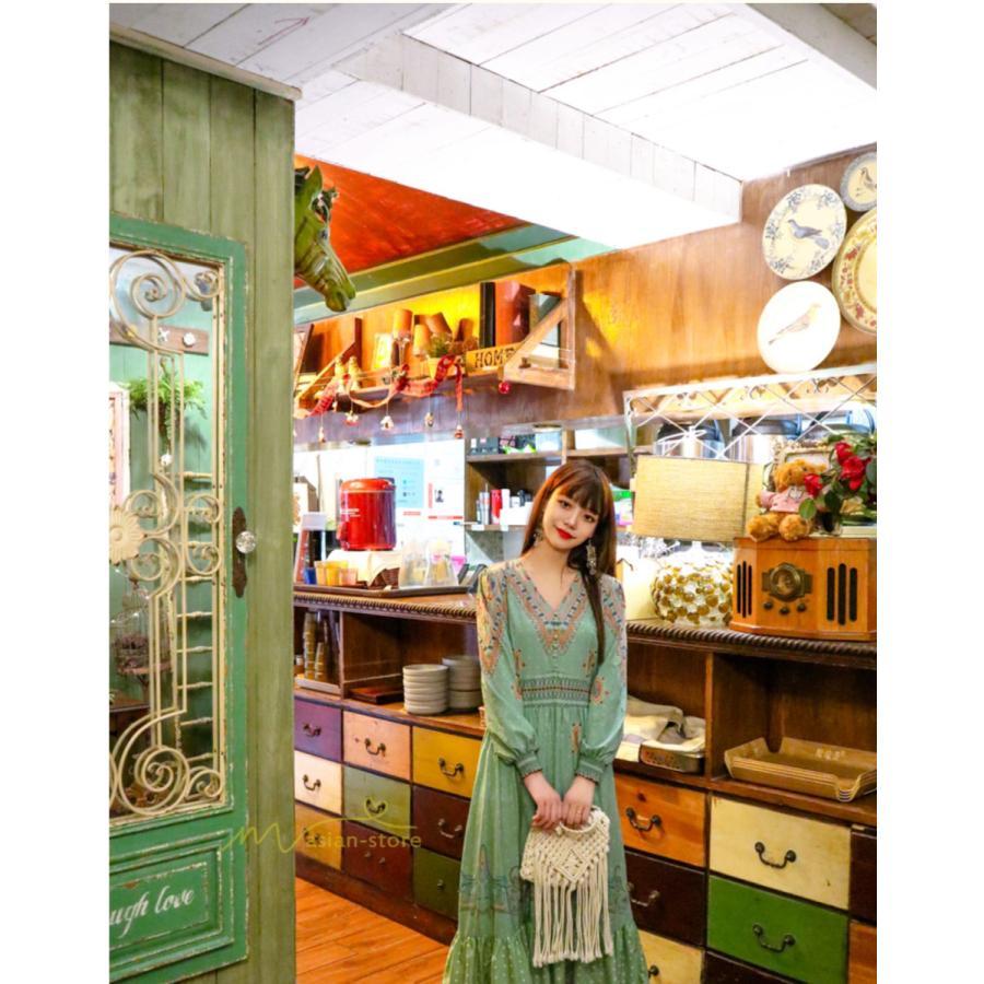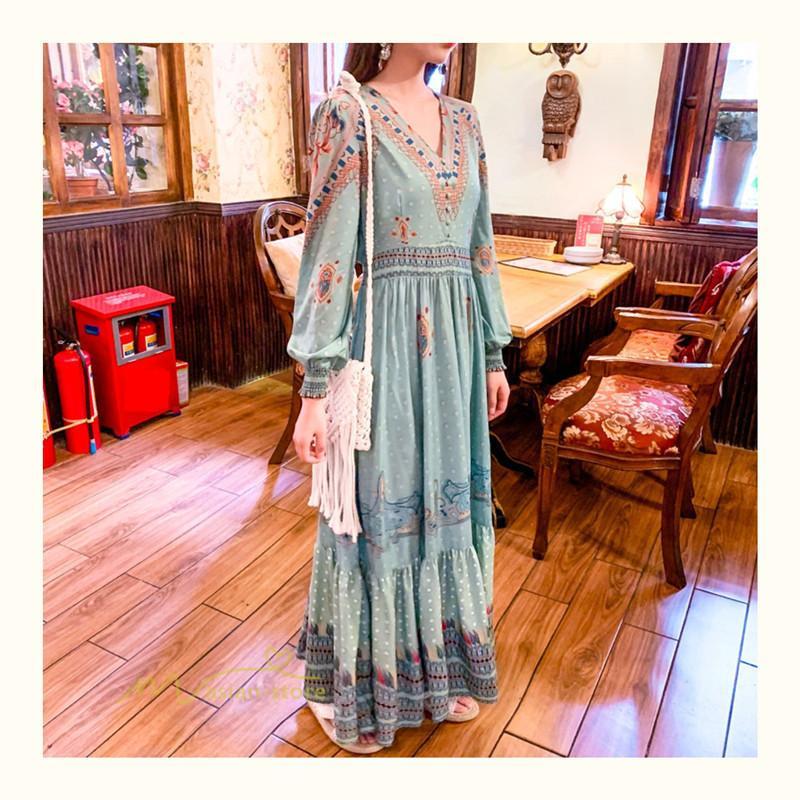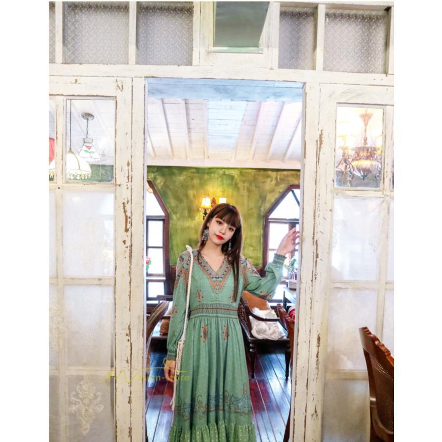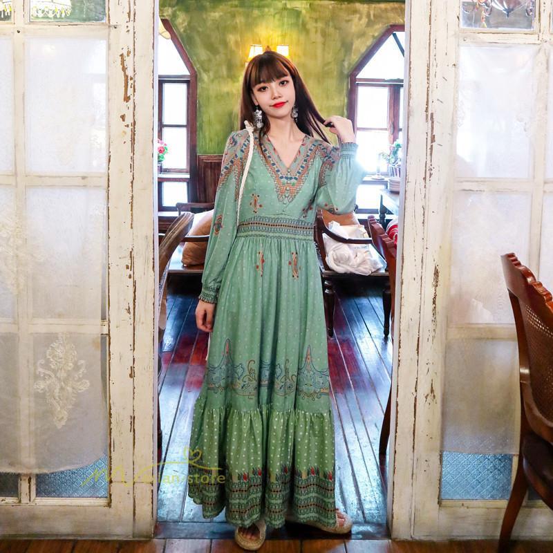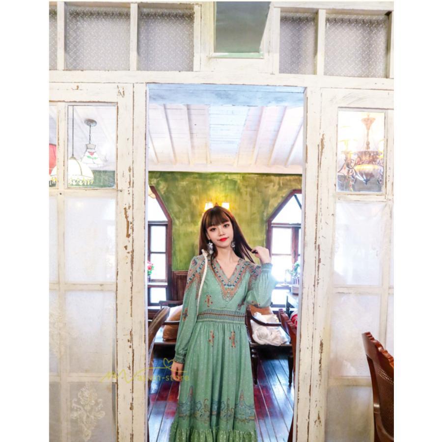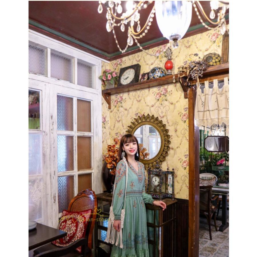 レディース 秋ワンピース 長袖 ドレス マキシ丈ワンピース 結婚式 夏服 レトロ風 ヴィンテージ風 Vネック プリント ウエストマーク