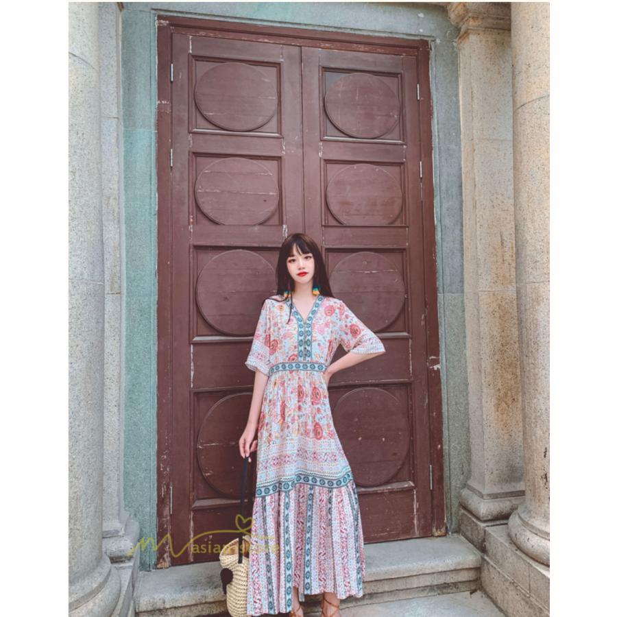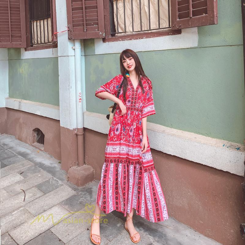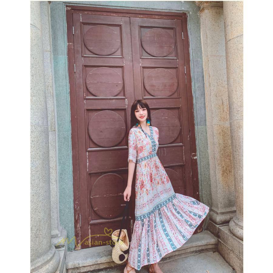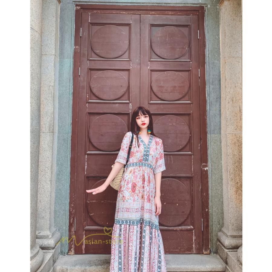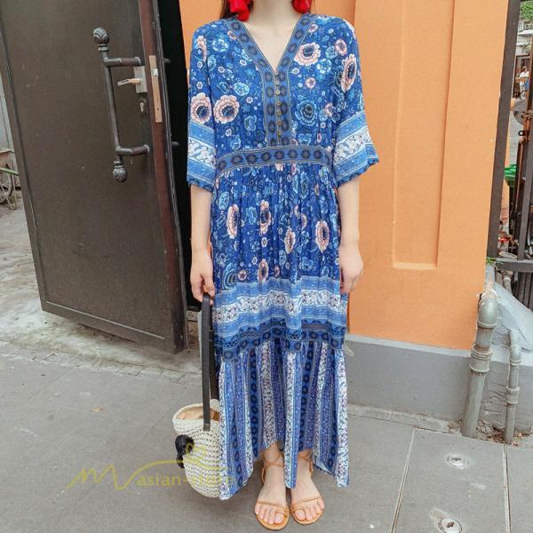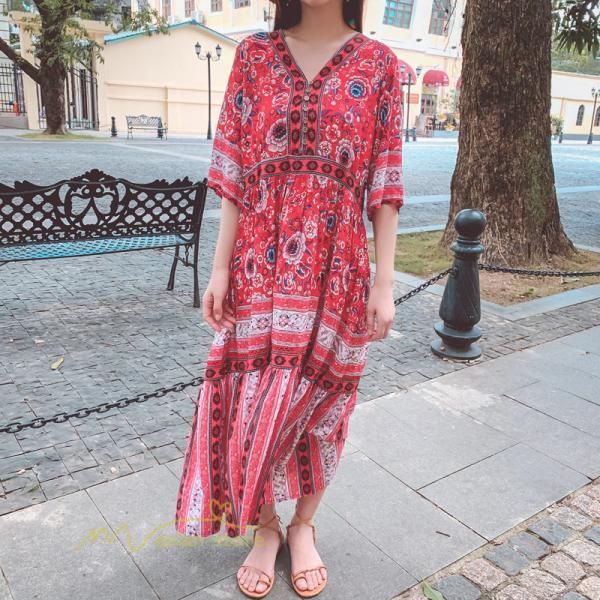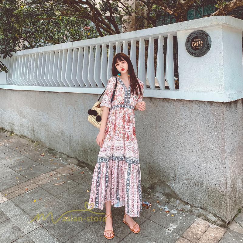 レディース 秋ワンピース 半袖 ドレス マキシ丈ワンピース 結婚式 夏服 レトロ風 ヴィンテージ風 Vネック プリント