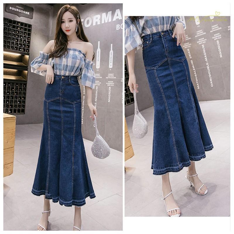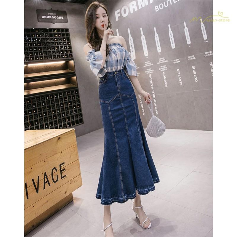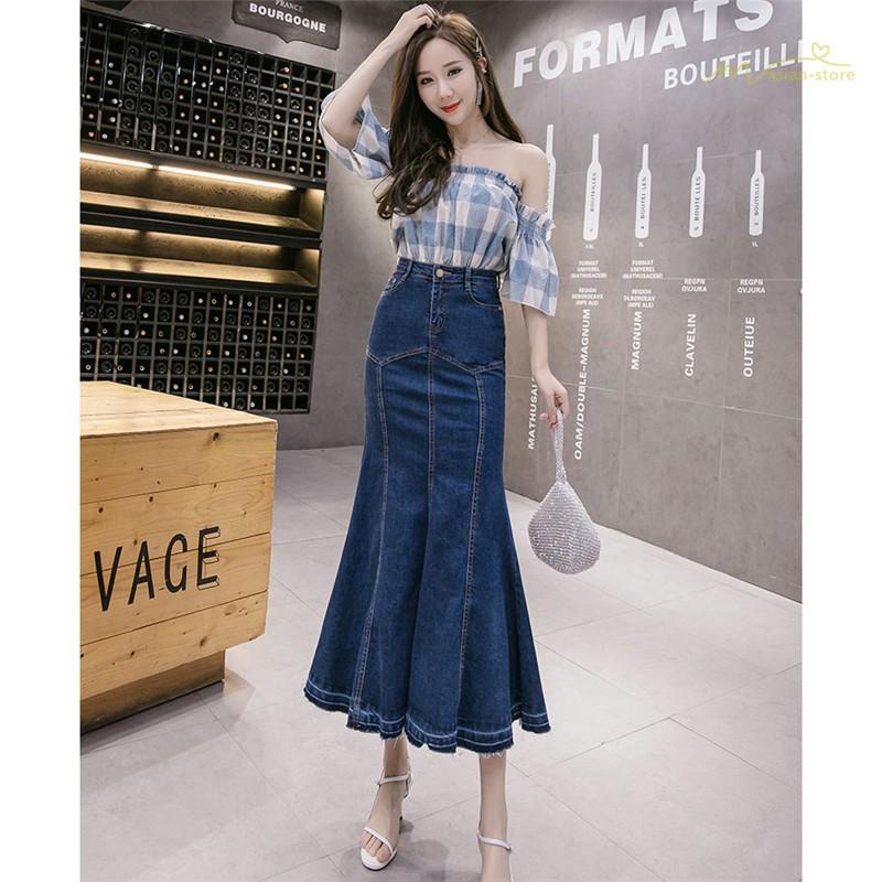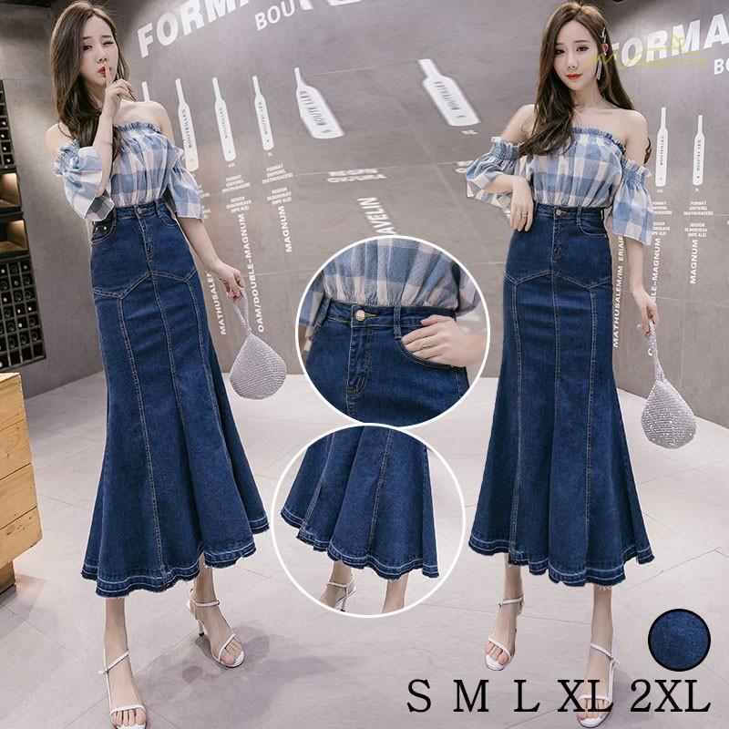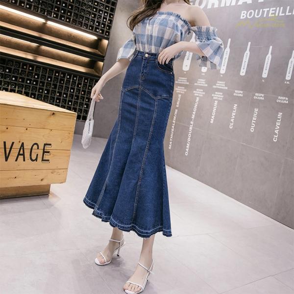デニムスカート マーメイド ハイウエスト デイリーコーデ フェミニン ボトムス タイトスカート プリーツフレア ロング丈 フリルスカート スタイリッシュ