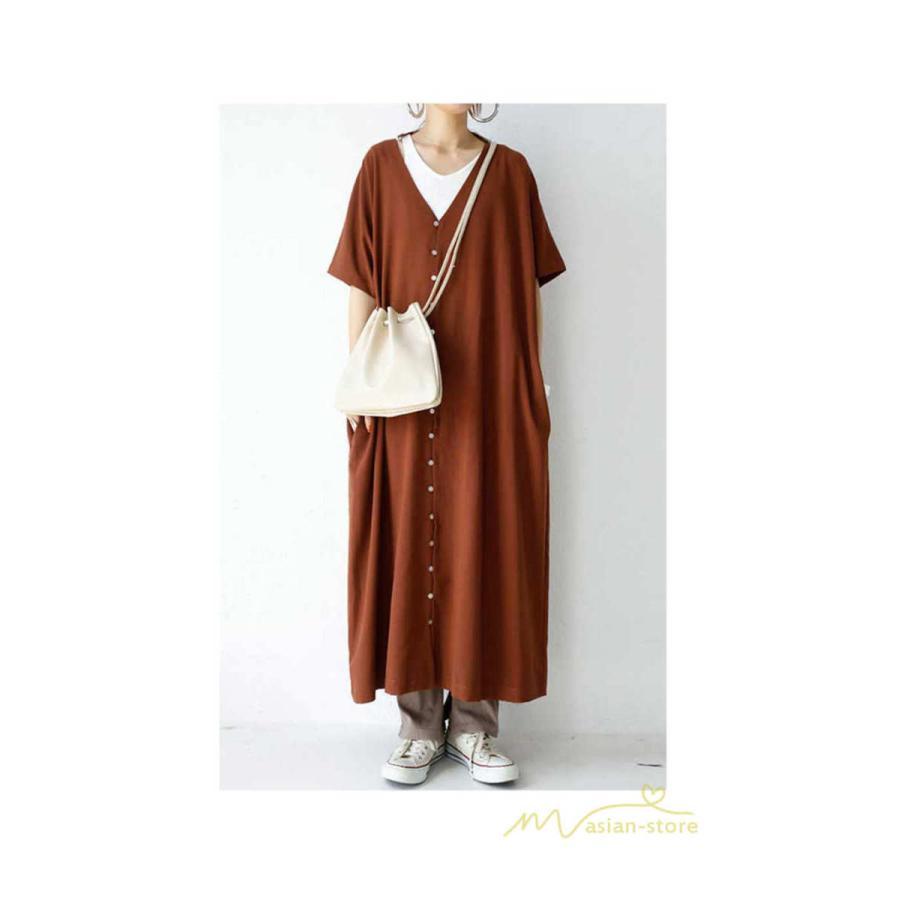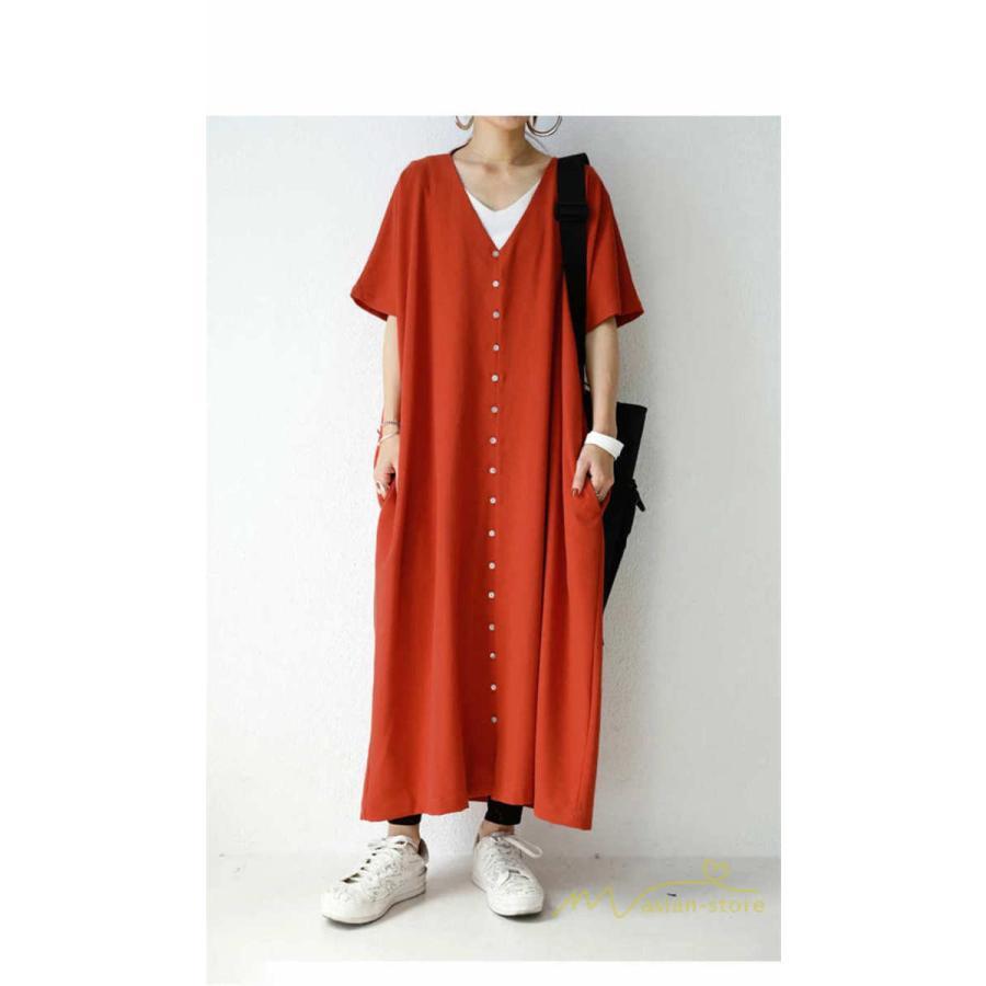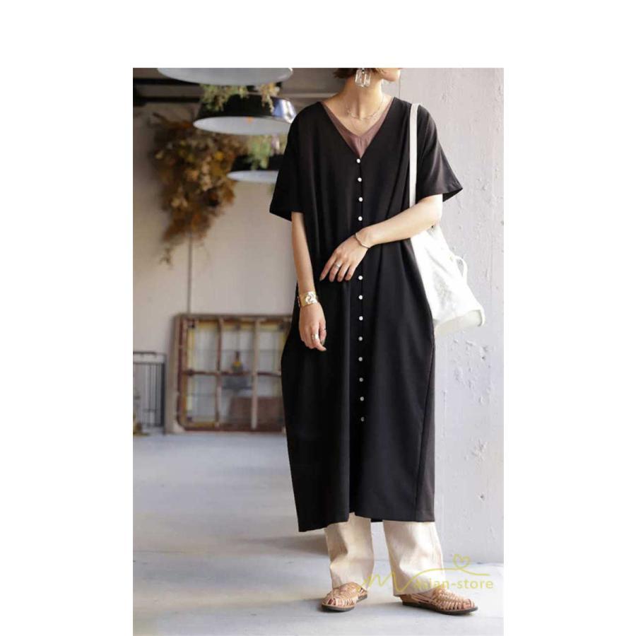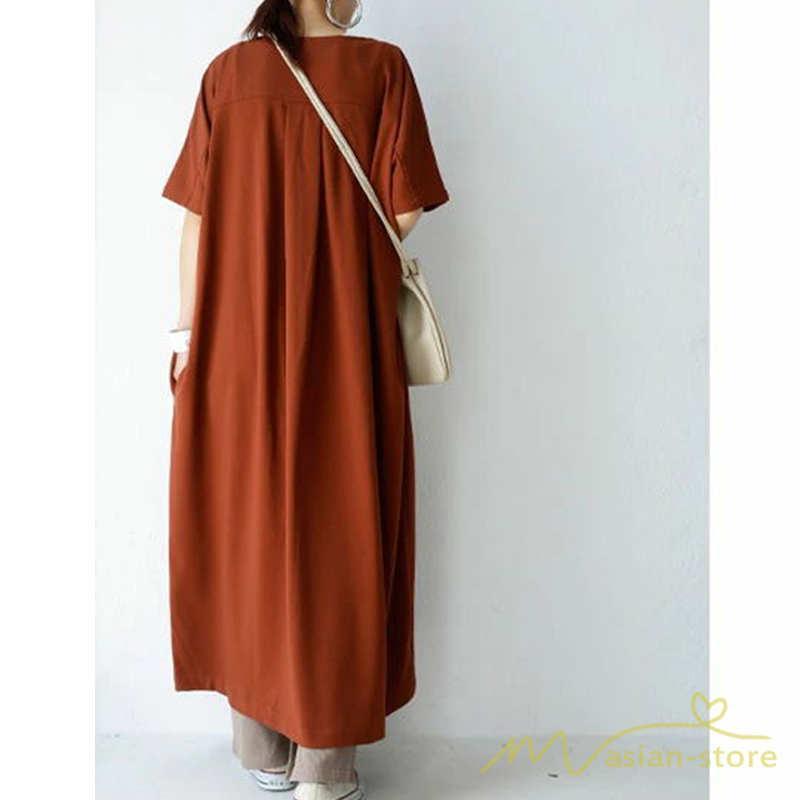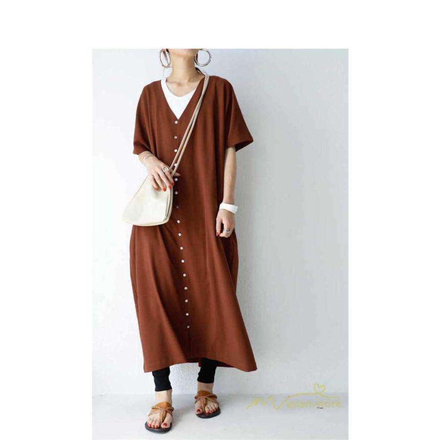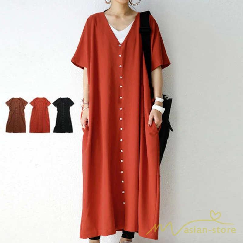 ワンピース レディース シャツワンピース 半袖 七分袖 5分袖 パフスリーブ vネック Aライン ロング ミモレ丈 マキシ丈 体型カバー マキシワンピース 春 夏 カジュアル ゆったり レディースファッション 20代 30代 綺麗 新品 新作 秋物 秋服