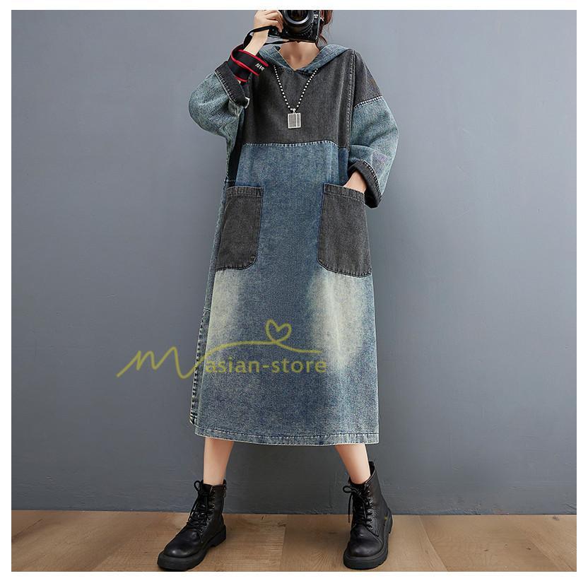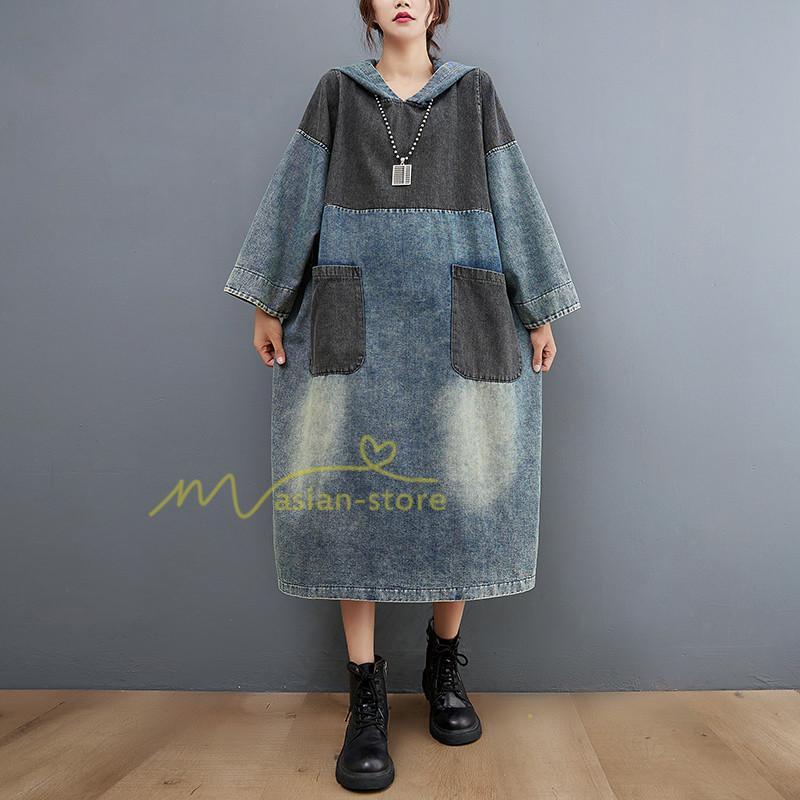 マキシ | ワンピース レディース デニムワンピース ロングワンピース 長袖 大きいサイズ 着痩せ 体型カバー 通勤 OL お出かけ 春秋 フード付き 上品 30代/40代/50代/60代