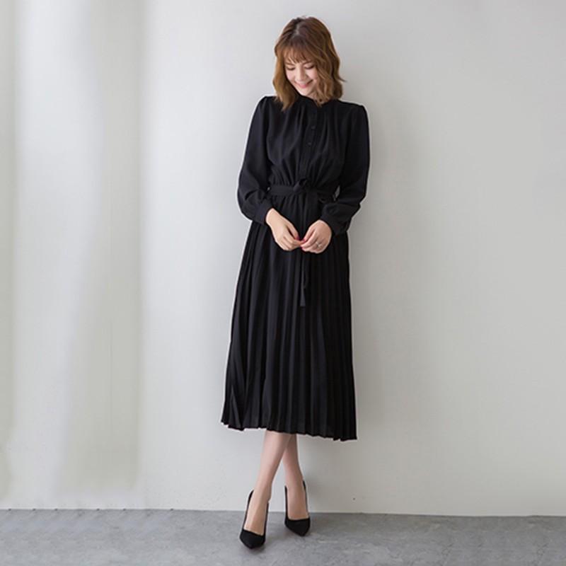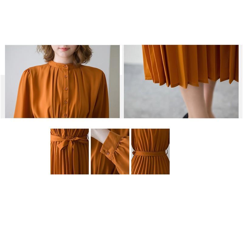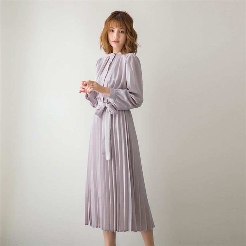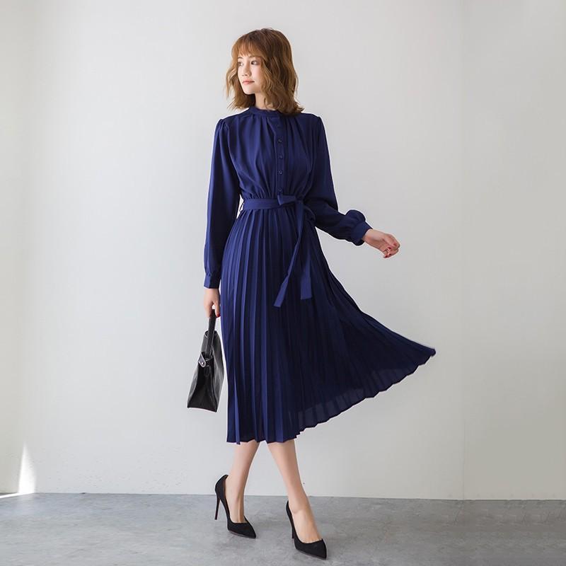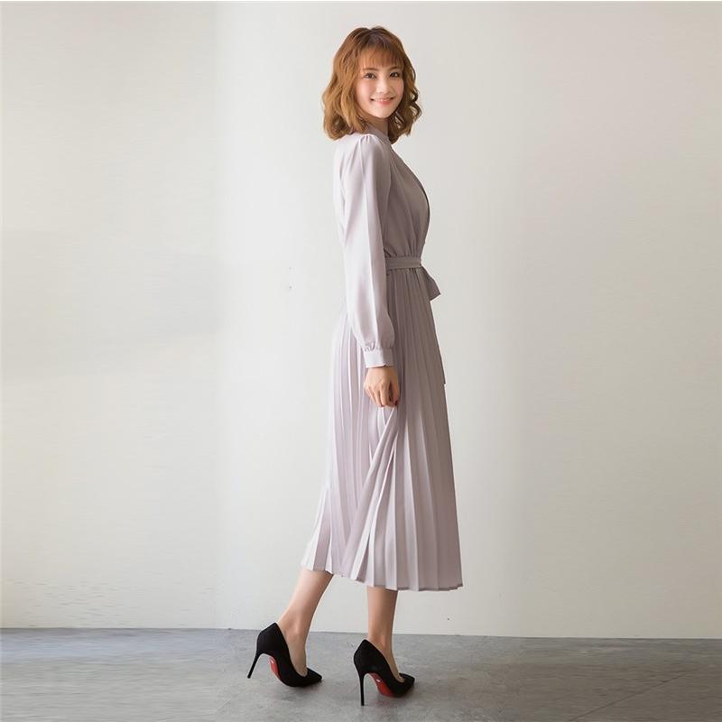 マキシプリーツワンピース ロングフレアシフォンワンピース 無地長袖リゾート