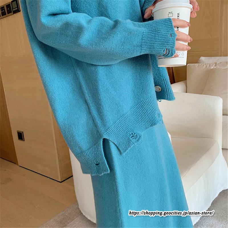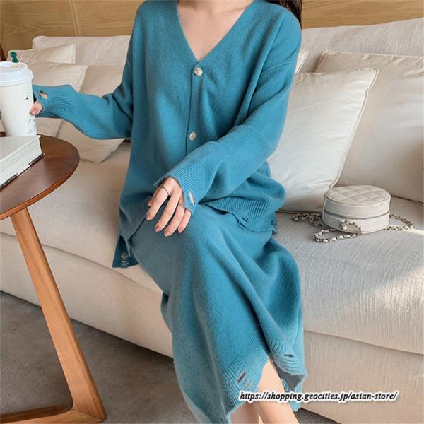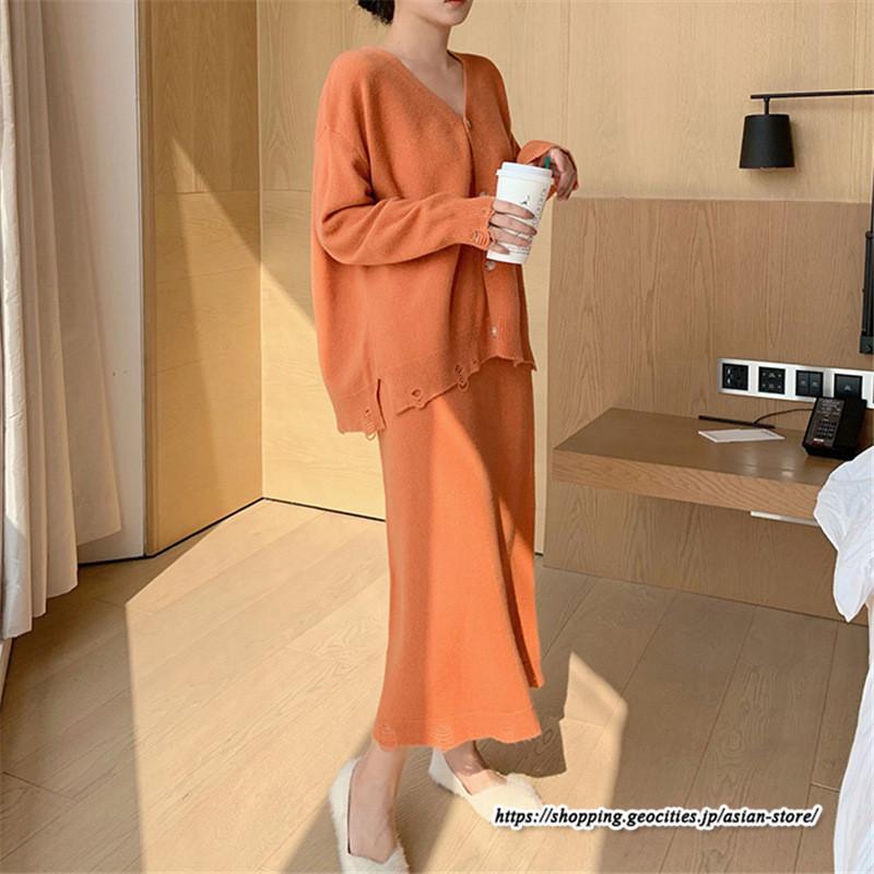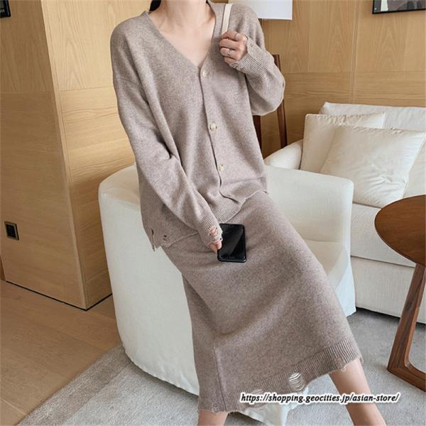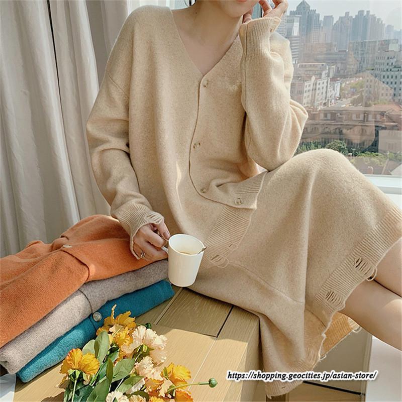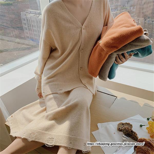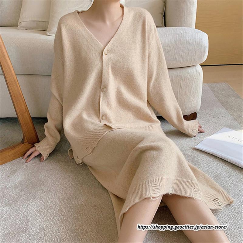 カーディガン Vネックニット トップス アウター スカート ストレートスカート ゆったり 体型カバー